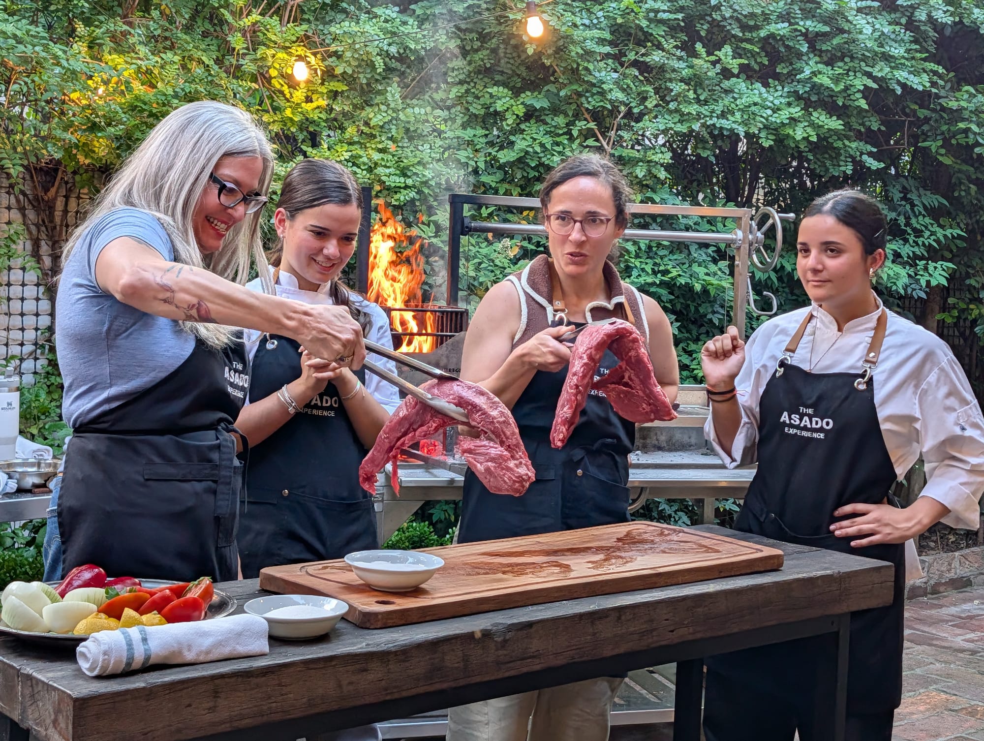 We were attending a backyard asado—a barbecue—at a private home in Buenos Aires. Three young women chefs, the asadoras, were teaching us the secret techniques of this quintessential Argentinean tradition. We had already learned how to select the right wood for the fire, how to spread the coals for a mix of direct and indirect heat, and how to carefully split chorizo sausages and nestle them into toasted rolls to make spicy choripan sandwiches. Thirteen of us travelers were gathered around hot fires as the asadoras prepared our next course: plump, sizzling blood sausages.