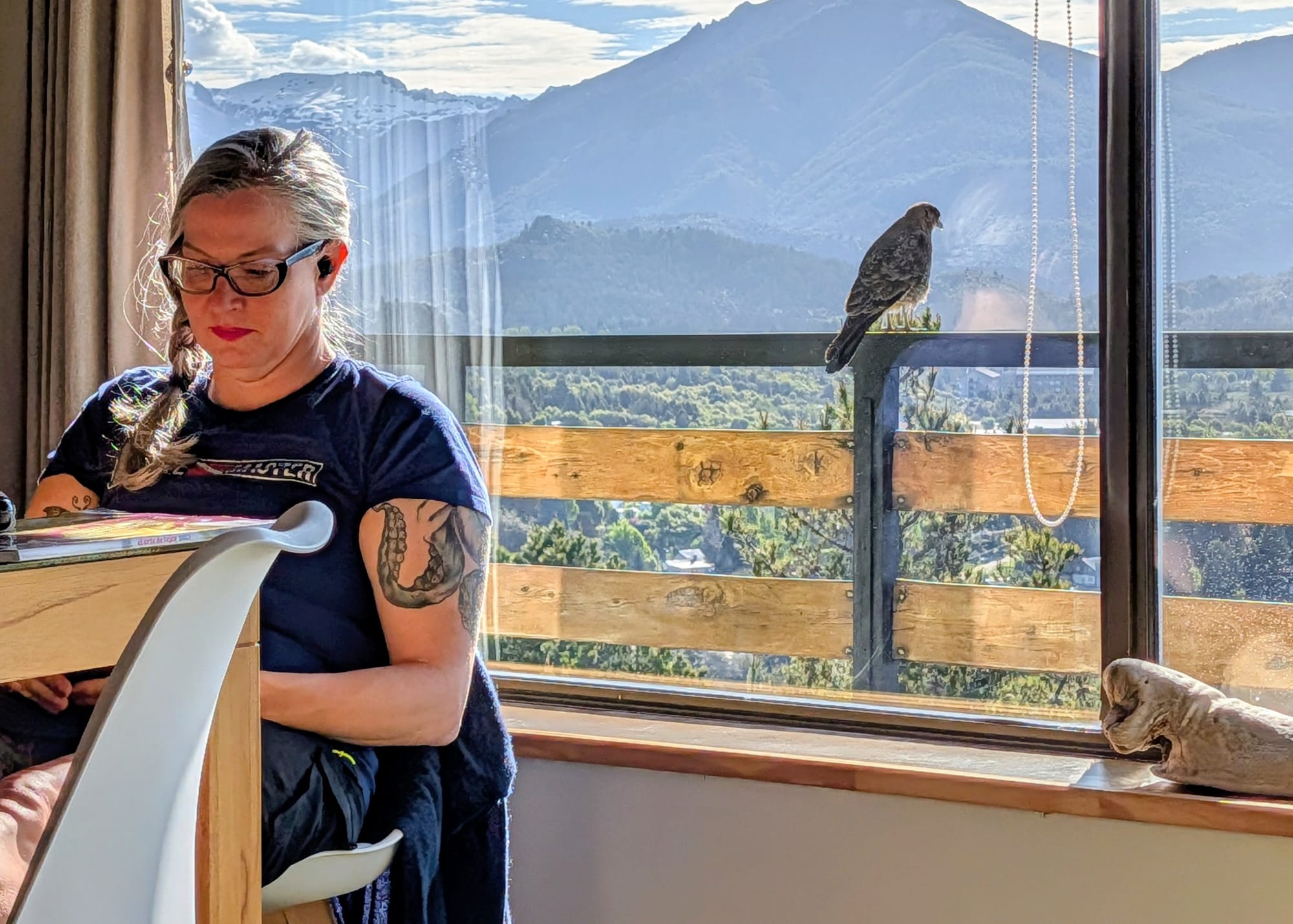 Our Airbnb stood on a hill overlooking lake Nahuel Huapi, with a view that, to paraphrase the Argentinean band Berlin, left us with no more words. Dramatic snow-covered mountains in the Andes rose into the distance while hawks circled the treetops near the windows, sometimes alighting on the deck railing to peer in the windows and watch us soak in the in-room hot tub.